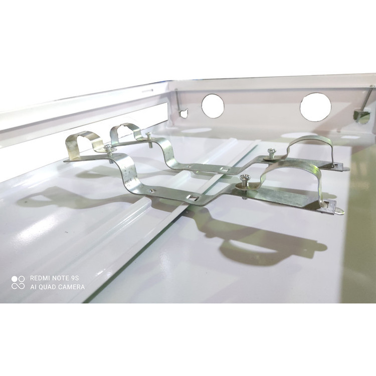 در این محصول از ورق فولادی با ضخامت 0.7 میلی متر استفاده شده است و با توجه به نوع ساخت کفی که یک تکه است، استحکام کافی برای استفاده را دارد. از رنگ الکترواستاتیک سفید در این محصول استفاده شده است که رایج ترین رنگ جعبه کلکتور می باشد. درب جعبه بصورت ریگلاژی با قابلیت جدا شوندگی تولید شده است که استفاده از آن را سهولت میبخشد. جعبه بصورت مونتاژ شده داخل کارتن قرار گرفته که استفاده از آن راحت تر باشد. محتویات کارتن 2 عدد بست کلکتور گالوانیزه با ضخامت 2 میلی متر و 4 عدد پیچ و مهره برای اتصال درب به کفی است.
